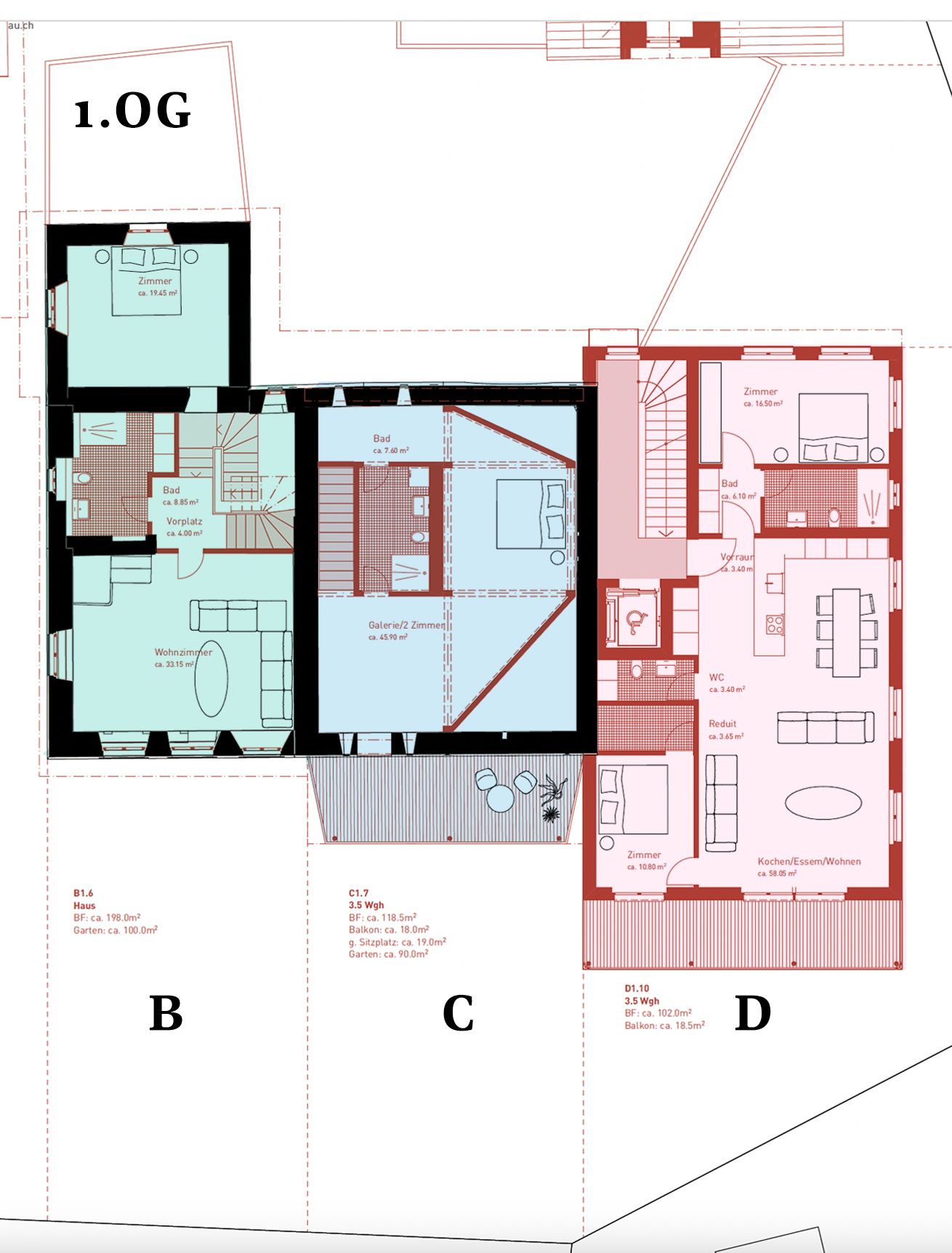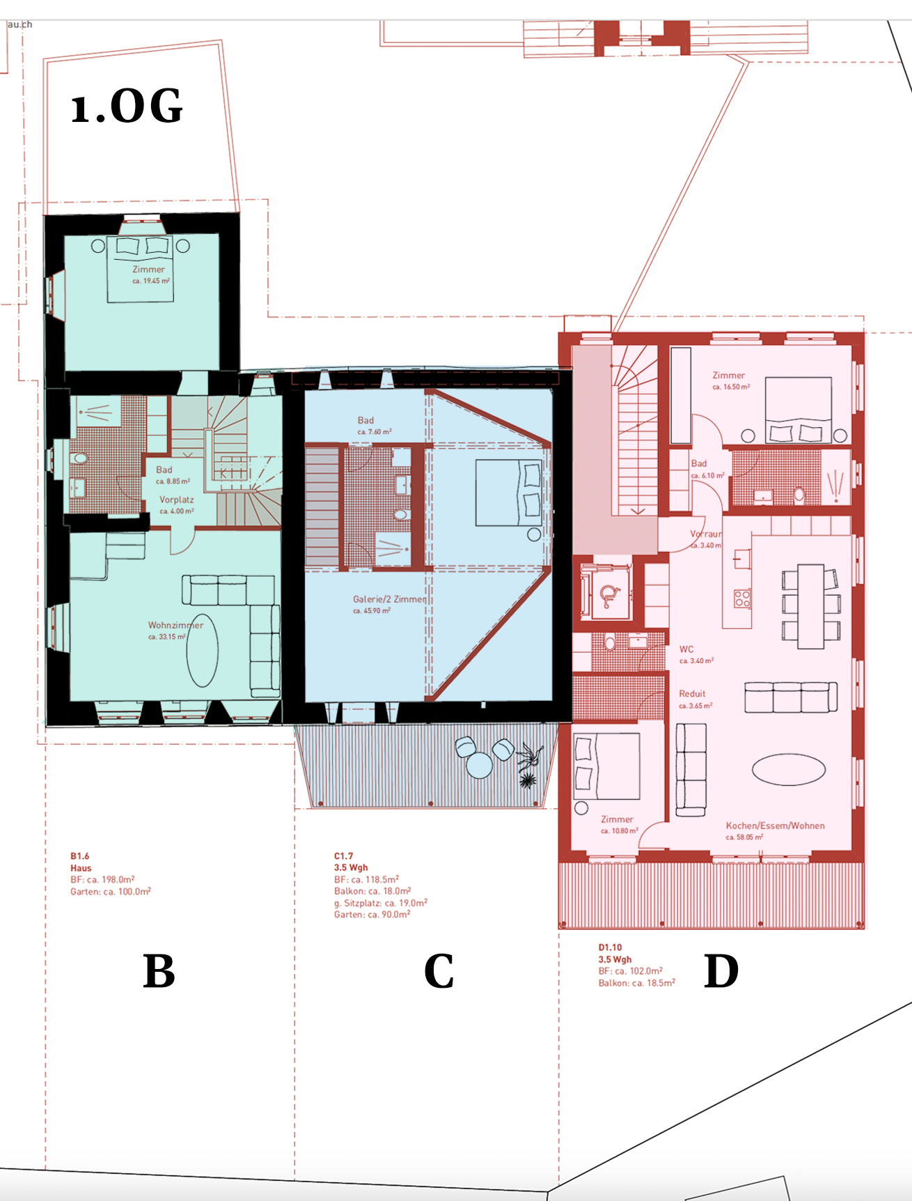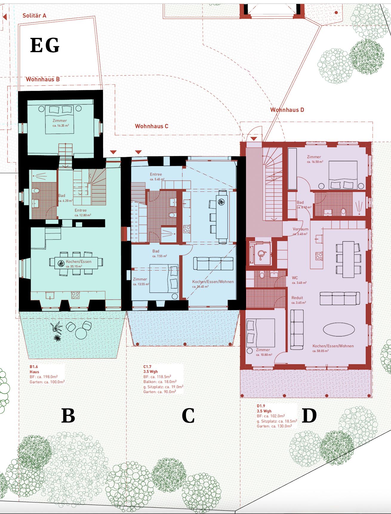 Wohnhaus C 1.7 | EG Maisonette – 3.5-Zimmer (116m²)Balkon (20m²) + gedeckter Sitzplatz (20m²) + Garten (90m²)