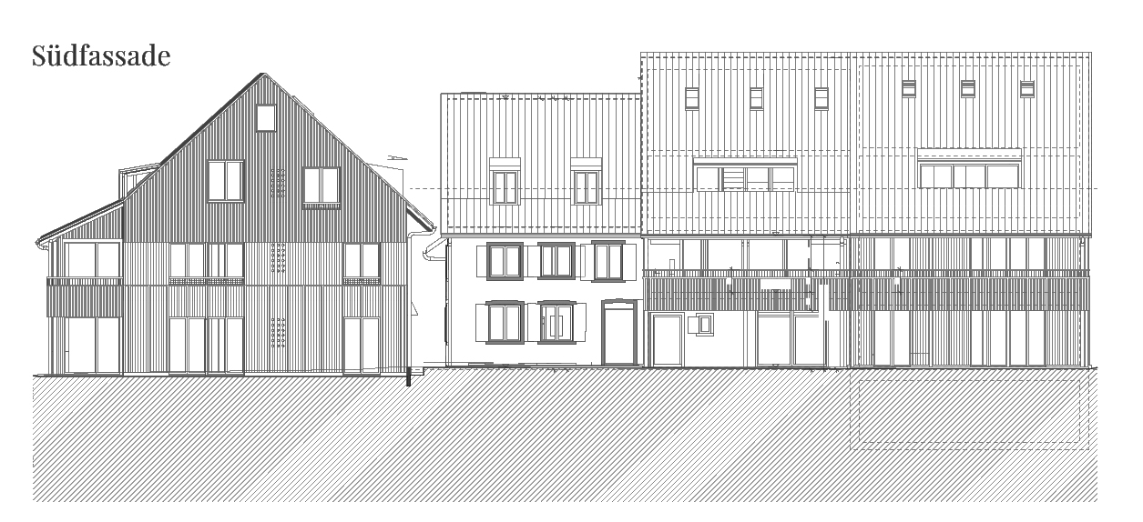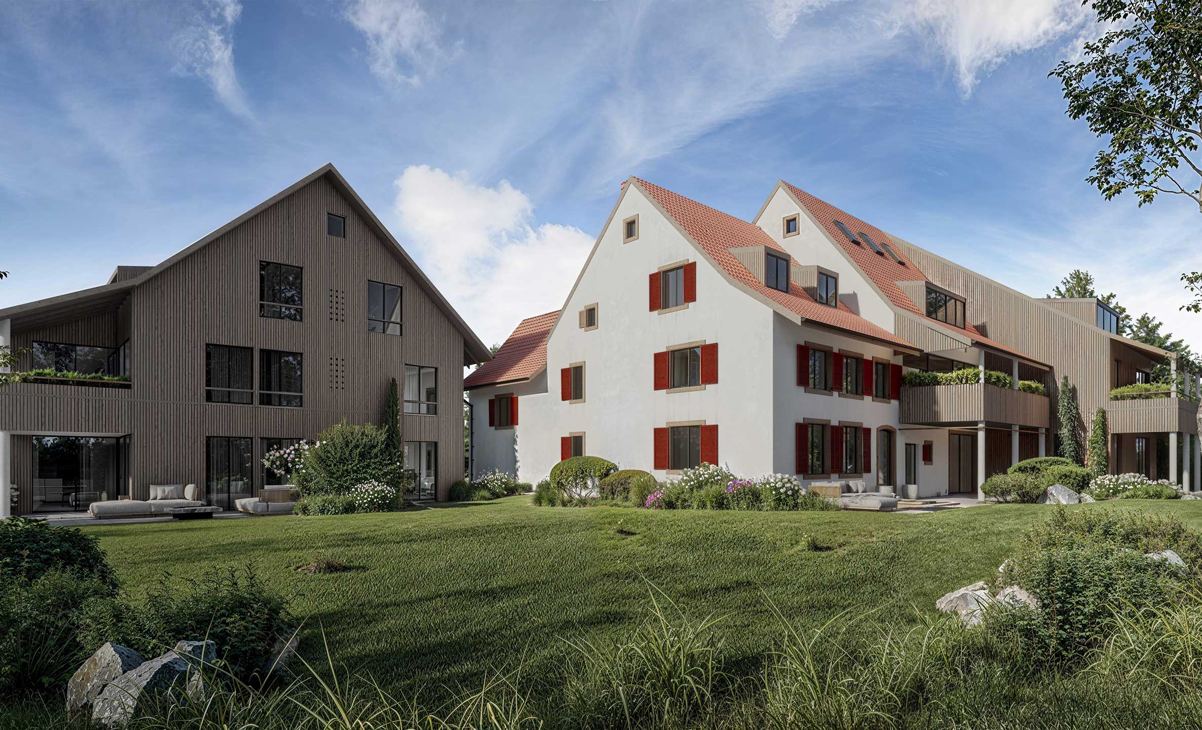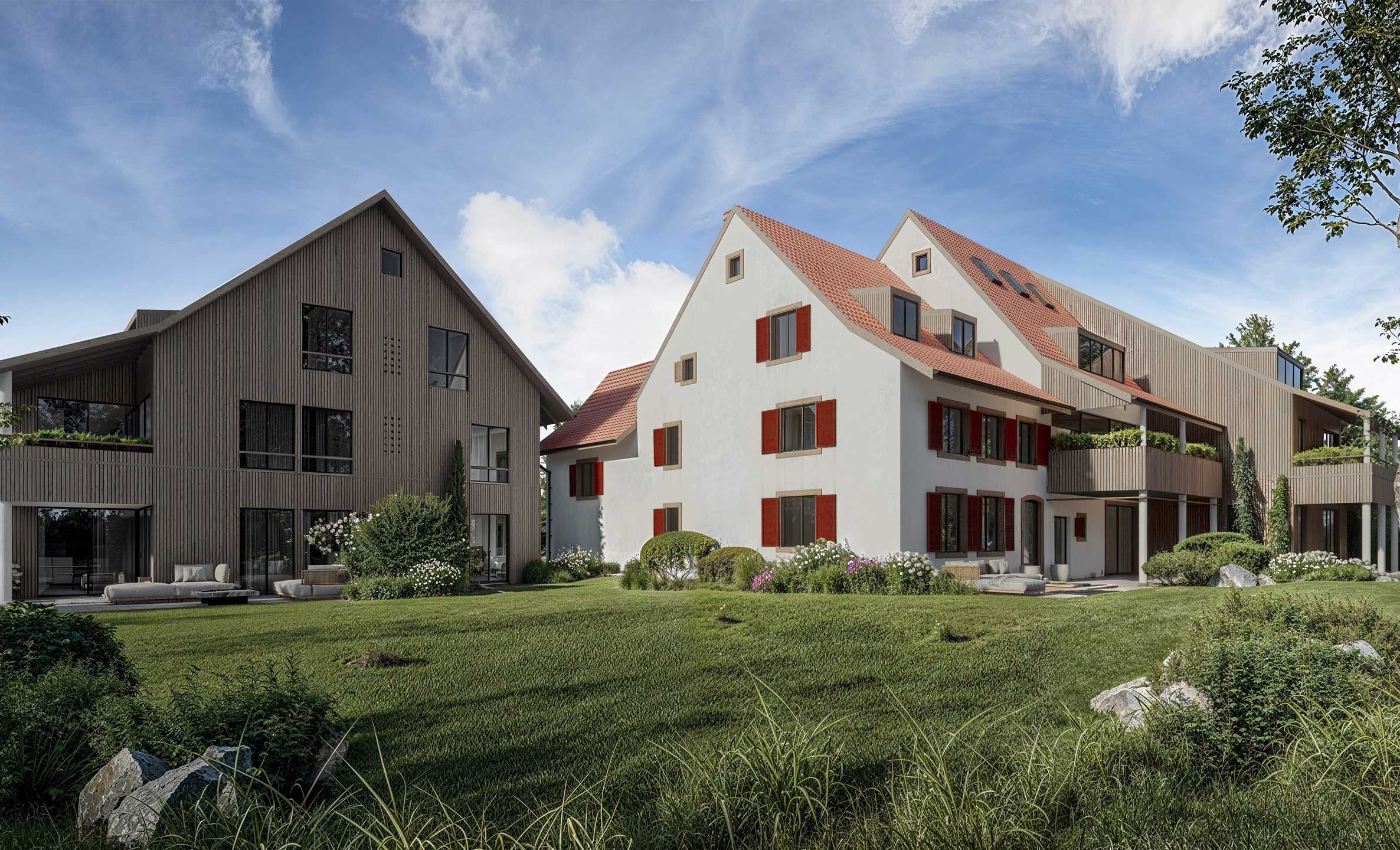 Die drei Bauten bilden ein harmonisches Ganzes, das die Toplage nutzt, um an das Bild des «wie es früher war» zu erinnern und somit dem grossen Plus des Grundstücks – luftig weiträumig transparent – Rechnung tragen.