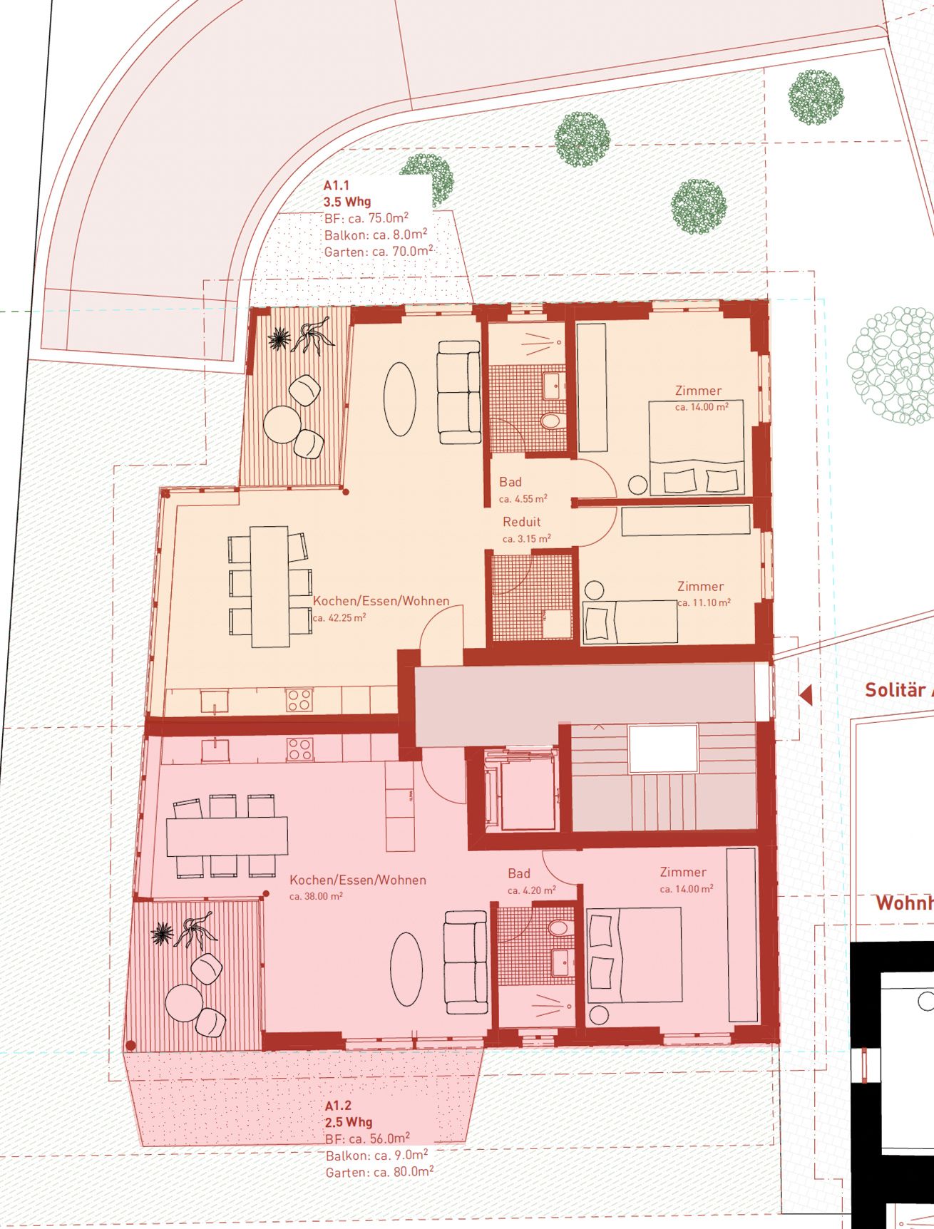 Solitär A 1.1 | EG Rechts – 3.5 Zimmer (75 m²)+ Balkon (8m²) + Garten (67.3m²)auf Anfrage