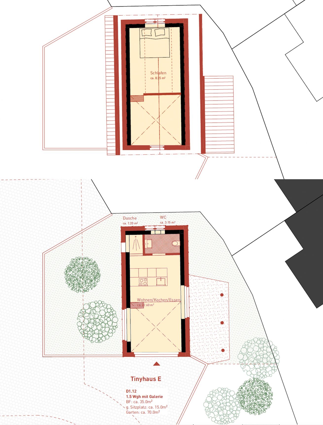 Tinyhaus E | 1.5 Zimmer (27.5m²) + Galerie (7.5m²)+ gedeckter Sitzplatz (15.0m²) + Garten: (70.0m²)