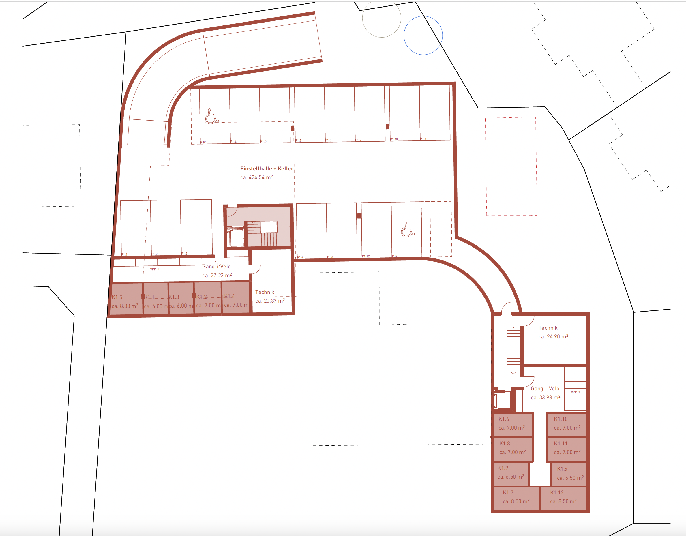 Übersicht Einstellhalle, Velo- und Technikraum sowie Kellerabteile